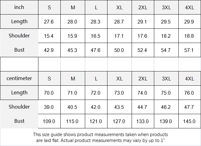 | Centimeter | S | M | L | XL | 2XL | 3XL | 4XL |
